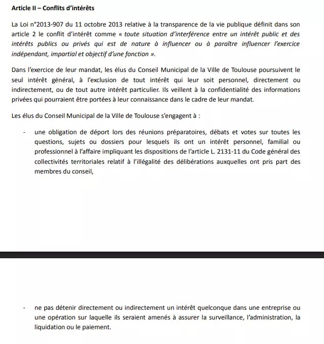 Pour rappel, la chartre de déontologie des élus municipaux de la ville de Toulouse précise dans sont article 2 :